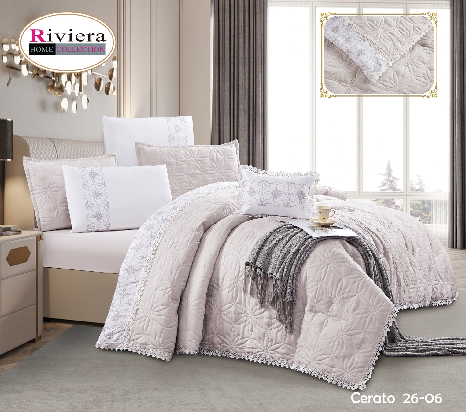 طقم ديباج Cerato من ماركة Riviera Home Collection – تصميم راقٍ بلون أنيق، وتطريز ناعم يضفي لمسة فخامة على غرفة نومك.