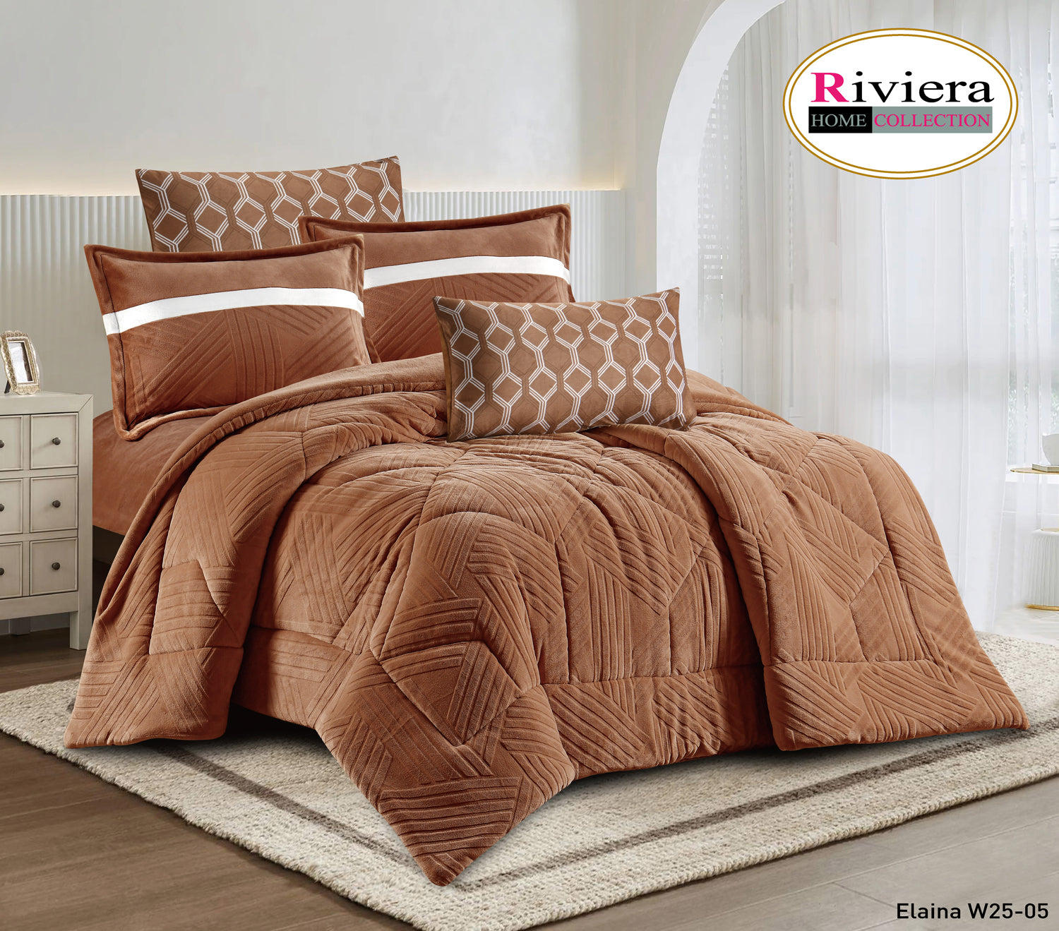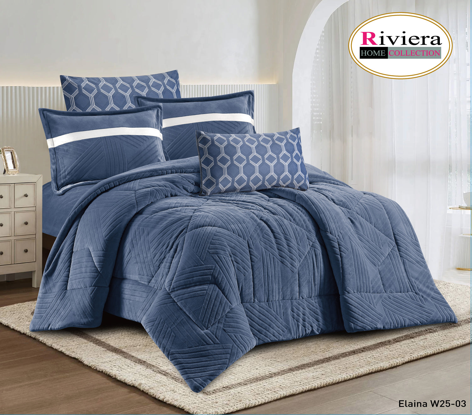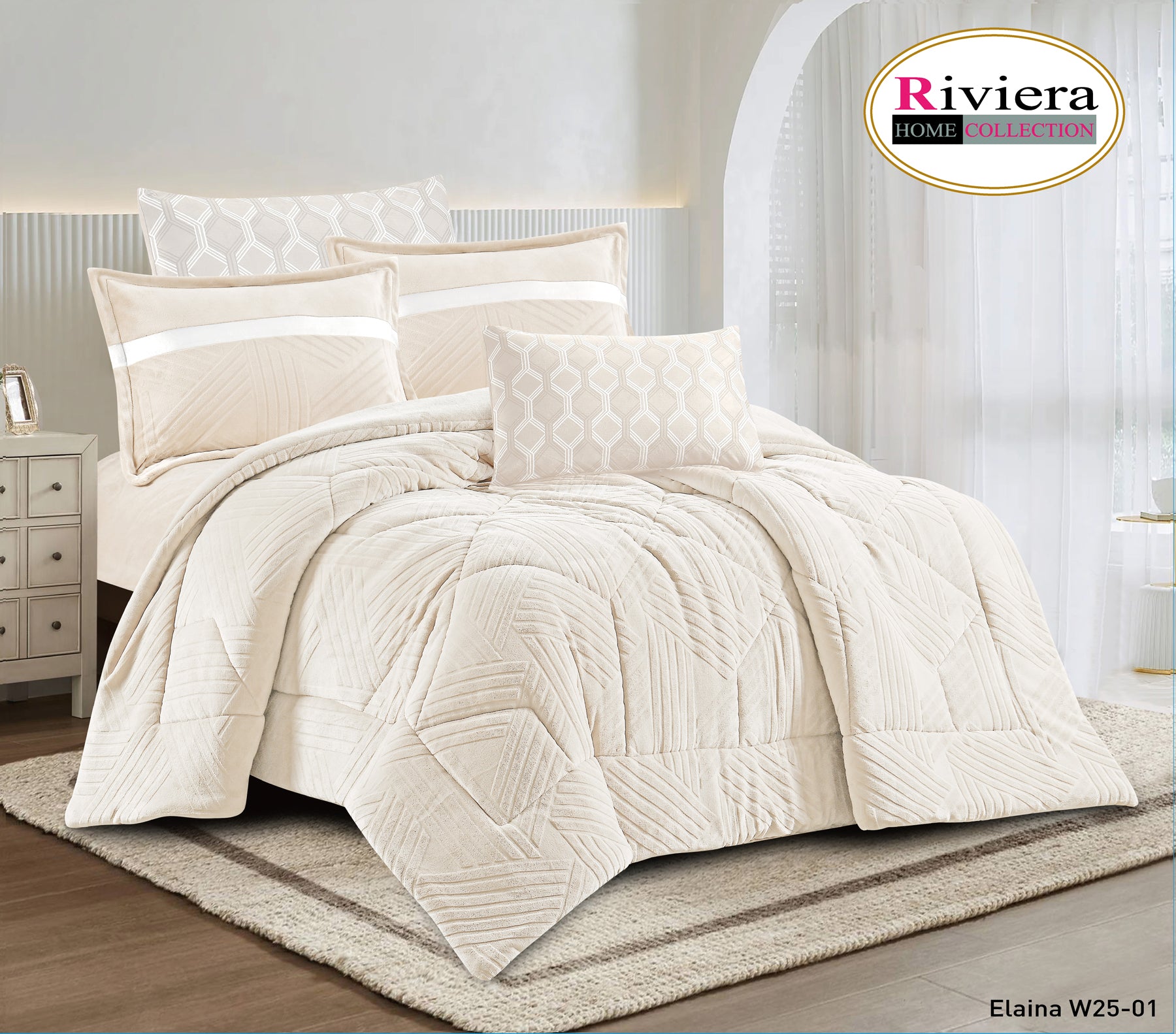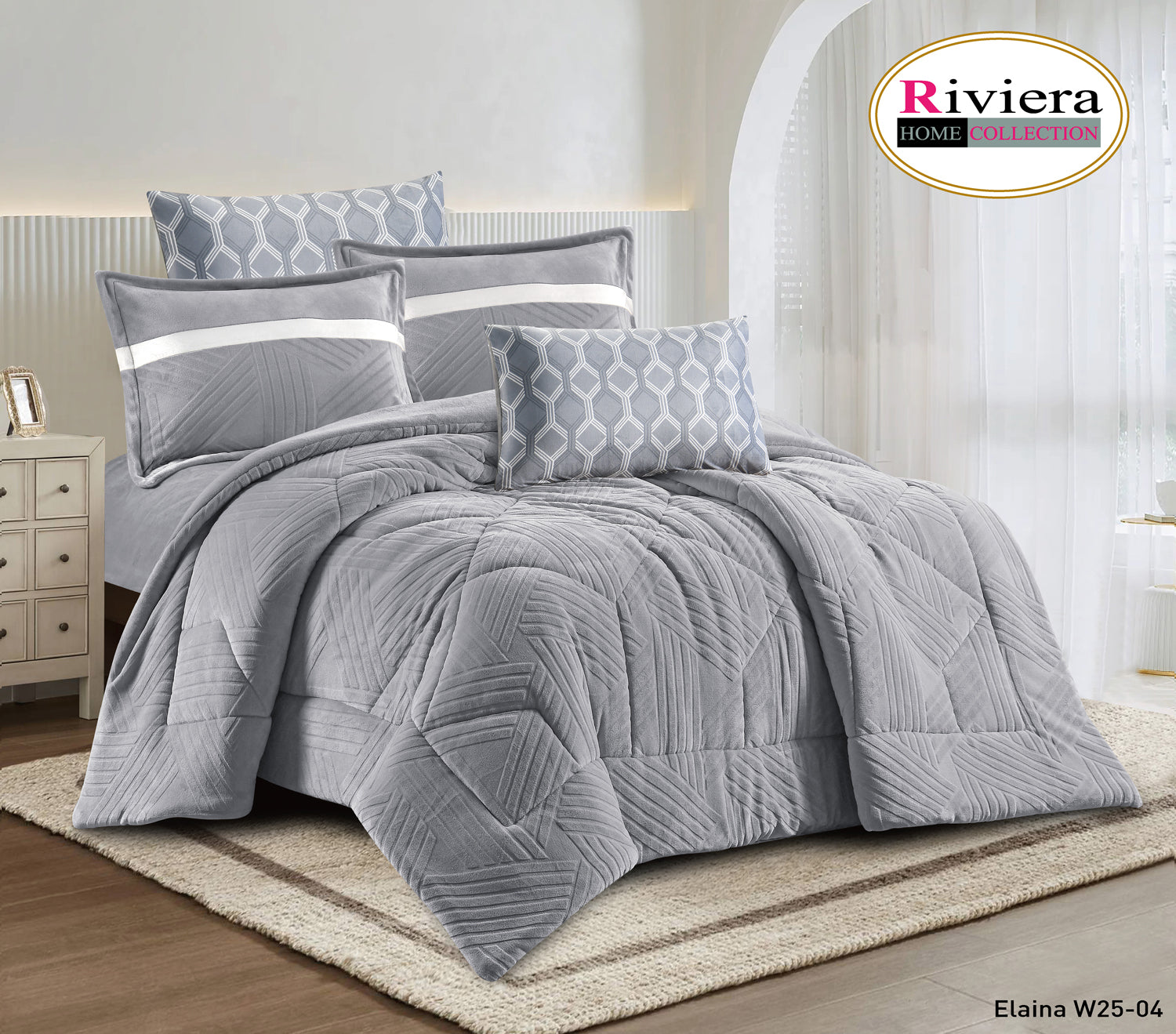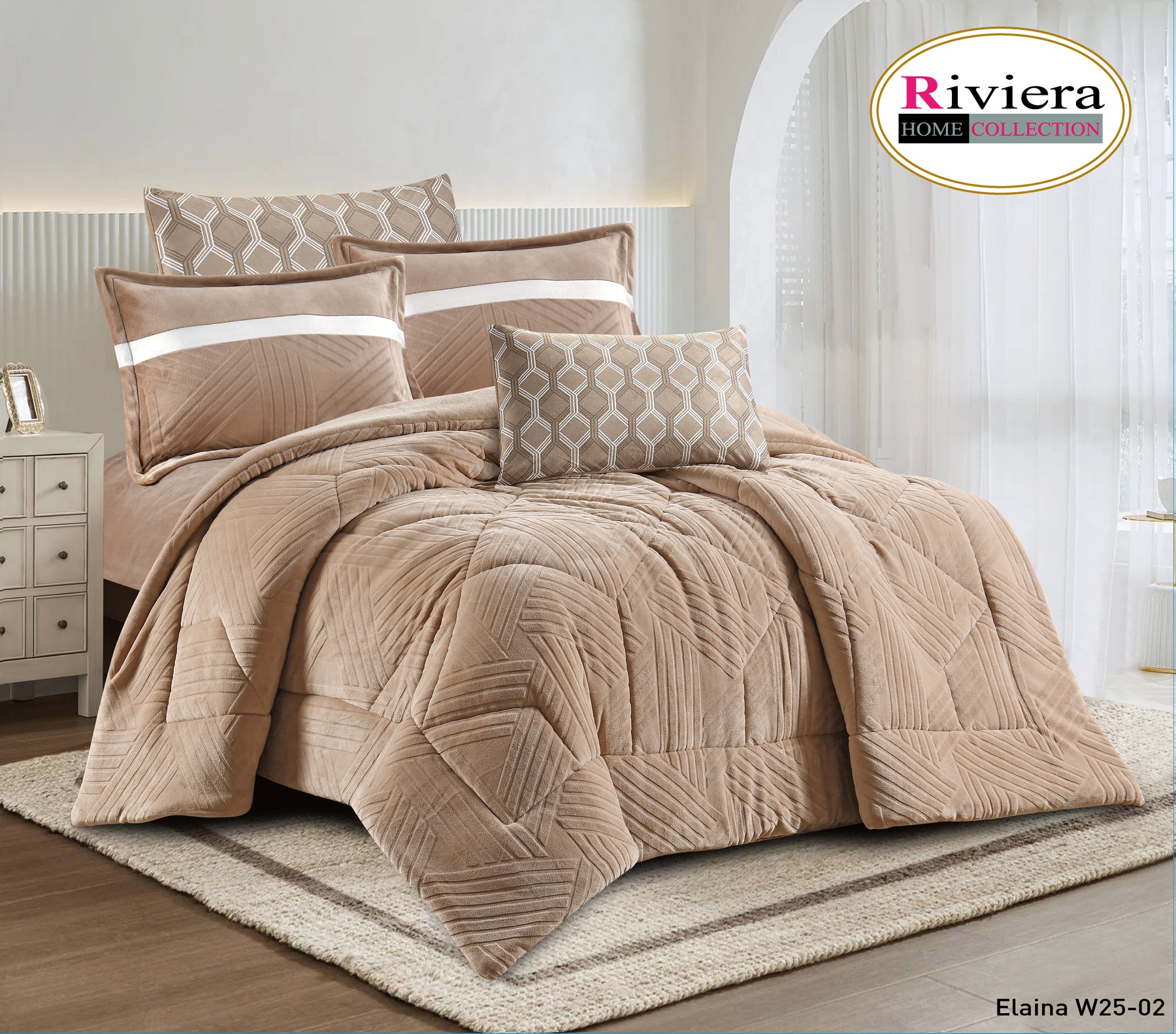 طقم Elaina بتصميمه العصري ونقوشه الراقية يضيف لمسة فخامة لغرفة نومك ويمنحك راحة استثنائية طوال الموسم.