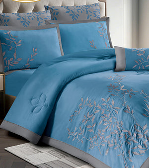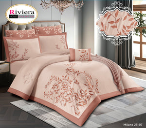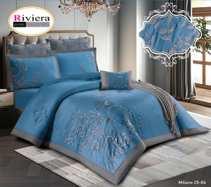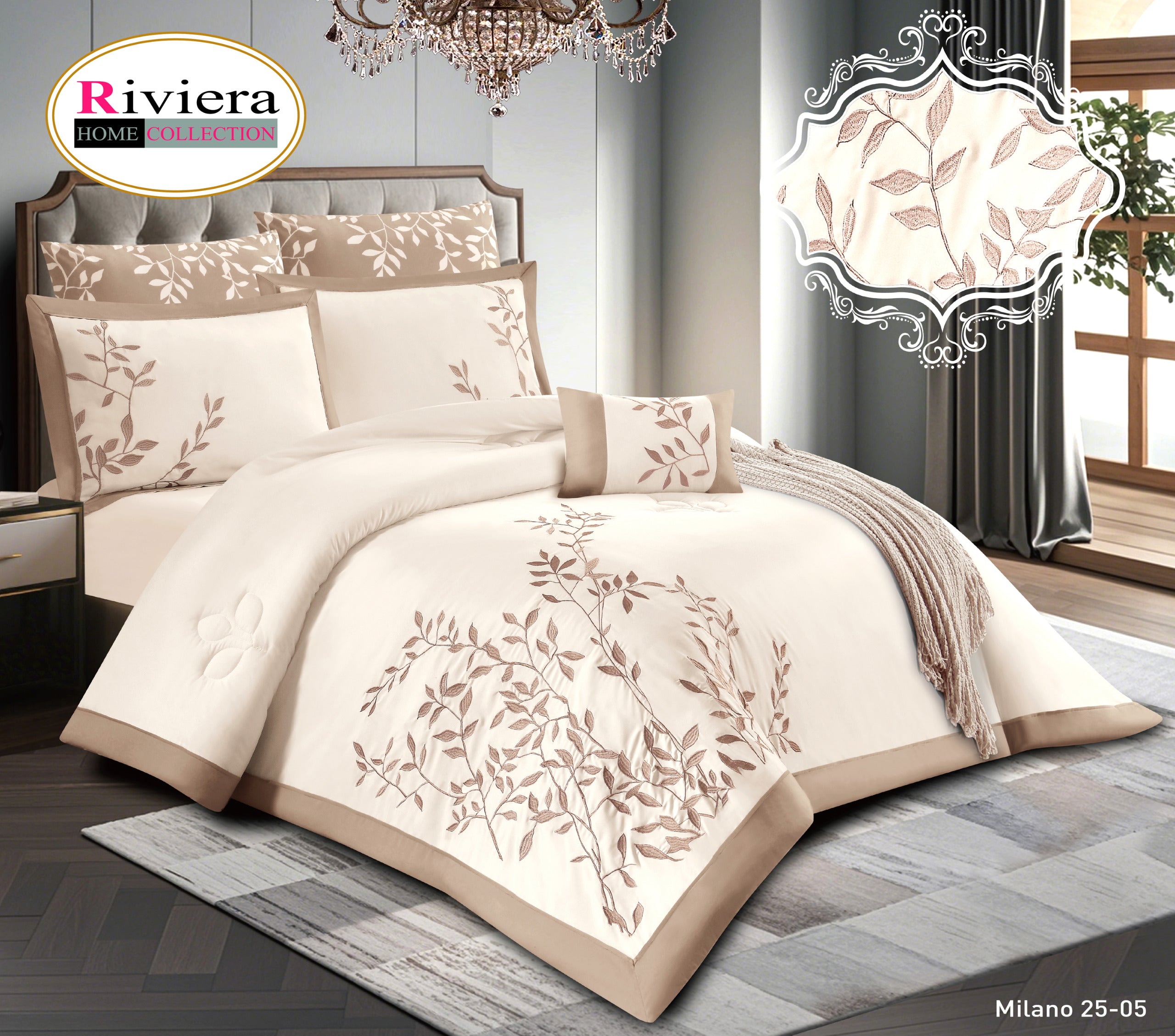 Bring a touch of quiet elegance to your bedroom with the luxurious Milano 25 set by Riviera. Featuring delicate leaf embroidery on a crisp white base, framed with soft grey edges for a sophisticated finish.