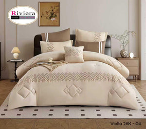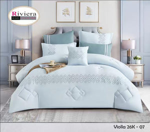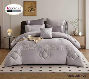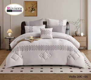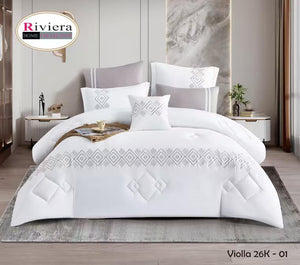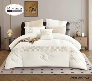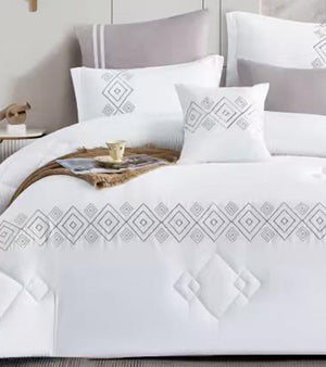 يتميز بلون أبيض أنيق مع تطريز هندسي ناعم يزين أطراف اللحاف والوسائد، ليمنح غرفة نومك مظهراً متناسقاً وأنيقاً. التفاصيل الدقيقة تعكس ذوقاً راقياً وتضيف إحساساً بالفخامة الهادئة.